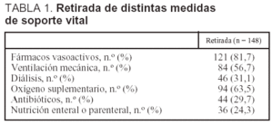 En nuestro país, aunque no se cuenta con datos específicos sobre la actitud de los profesionales ante los pacientes en EVP, los resultados de un estudio sobre limitación del esfuerzo terapéutico realizado en 6 Unidades de Cuidados Intensivos y recientemente publicado32 muestran la menor tendencia a la retirada de la nutrición artificial frente a otras medidas de soporte vital (tabla 1).