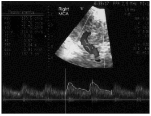 Figura 1. Patrón sonográfico de arteria cerebral media derecha por Doppler transcraneal con codificación de color (DTCC), realizado al ingreso. Se observa un patrón restrictivo con índice de pulsatilidad (IP) de 1,66 y velocidad diastólica de 25 cm/s.