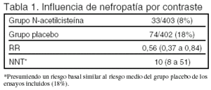 Conclusiones de los autores: la administración de N-acetilcisteína reduce significativamente el riesgo de nefropatía por contraste en enfermos con insuficiencia renal crónica.