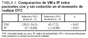 Si comparamos los resultados del DTC entre los pacientes tratados con midazolam en perfusión en el momento de realizar dicha exploración, observamos que persistieron las diferencias significativas entre los pacientes con EEG compatible con AIC y los que no obtuvieron ese resultado en esta prueba (tabla 3).