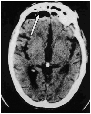 Fig. 1. Tomografía axial computarizada (TAC) craneal del caso 1 que evidencia neumoencéfalo frontal de 1 x 5 cm (flecha), con atrofia cortical.
