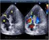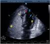 Mujer de 67 años en shock cardiogénico tras infarto de miocardio, con un seudoaneurisma y comunicación interventriculares (CIV): disposición oblicua, medial-anteroseptal a septoapical (fig. 1). Tras la estabilización, se repara con parche bovino. En controles ecocardiográficos objetivamos disfunción del ventrículo derecho (VD) y persistencia de la CIV: con escaso relleno diastólico del seudoaneurisma desde el VD y un predominante relleno sistólico turbulento desde el ventrículo izquierdo (VI), que evacúa al VD mediante 2 jets (Video 1). El salino agitado confirma un discreto relleno del seudoaneurisma desde el VD y rápido lavado del mismo desde el VI, así como el paso de algunas burbujas desde el VD al VI (fig. 2, Video 2). La grave disfunción derecha imposibilitó nueva reparación. Flechas amarilla: seudoaneurisma; flecha verde: CIV; flecha azul: burbujas en el VI; flecha roja: parche. Planos ecográficos: apical 4/5 cámaras y modificado.