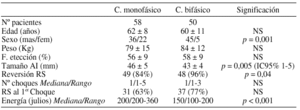 Conclusiones: Observamos en nuestra serie una diferencia significativa a favor del choque con onda bifásica, consiguiendo además RS con menor energía. Estos datos coinciden con los referidos en otros trabajos. Debe tenerse en cuenta que en nuestra serie hay una diferencia importante en el número de mujeres (que ningún autor relaciona con la eficacia de la cardioversión), y que los tamaños AI son menores en el grupo bifásico (aunque creemos que no es clínicamente relevante una diferencia en el tamaño AI entre 1 y 5 mm).