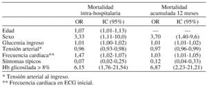 Método: Estudio prospectivo de todos los pacientes ingresados con IAM en los últimos 3años (enero 2000-diciembre 2002) en los que además de la glucemia al ingreso y el número de glucemias superiores a 200 mgr/dl durante la estancia en la Unidad Coronaria, se determinó la hemoglobina glicosilada al ingreso. Se realizó un análisis de regresión logística para determinar si, entre otras, las mencionadas variables podían presentar valor pronóstico independiente para la mortalidad hospitalaria y al año.