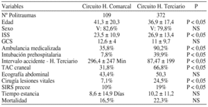 Conclusiones: Los pacientes que ingresan directamente en el hospital terciario son más graves y presentan una mayor morbilidad, estancia media y mortalidad. Hay diferencias marcadamente significativas en la práctica clínica entre los dos circuitos. Pensamos que este modelo de trabajo puede ser útil para plantear mejoras en la asistencia traumatológica global.