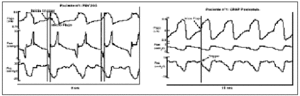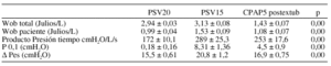 Resultados:Figura 1: Trazado de Flujo, Presión en vía aérea (Paw) y Presión esofágica (Pes) durante PSV y CPAP postextubación en paciente nº1: Durante PSV se aprecia retardo en apertura de válvula de demanda con esfuerzo ineficiente y concavidad marcada inspiratoria en curva de Paw por flujo insuficiente a las demandas inspiratorias. Estos hallazgos desaparecen tras aplicación de CPAP no invasiva.