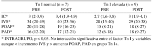 Conclusiones: Los datos preliminares indican que en el grupo de Tn I elevada, el aporte de volumen produce aumento de presiones de llenado, lo que sugiere alteración de contractilidad y/o distensibilidad, aunque no alcanza significación estadística. En base a estos resultados, es necesario completar el estudio para verificar esta observación.