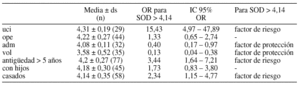 Resultados: El tipo de trabajo (uci, ope, vol o adm) fue el primer factor seleccionado para el nivel de SOD (p < 0,0001); 2º la antigüedad en la profesión (p = 0,0001); 3º el tener hijos (p = 0,015) y 4º el estado civil (p = 0,036).