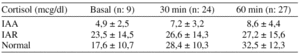 Resultados: Nueve pacientes (15%) presentaron IAA, 24 (40%) IAR y 27 (45%) una función adrenal normal. Los valores de cortisol basal y a los 30 y 60 min. de administrar ACTH se presentan en la tabla.