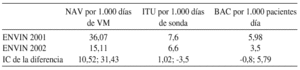 Material y método: Siguiendo los criterios de NAV, ITU y BAC del ENVIN y la recogida de factores de riesgo en cinco UCIs de Castilla y León se comparan las tasas del corte del ENVIN nacional (Mayo y Junio del 2001) con otro corte realizado tras una reunión en que se insiste en la metodología de recogida de datos y que se estudia de julio a septiembre del 2002. Se presentan las tasas y los intervalos de confianza de la diferencia.