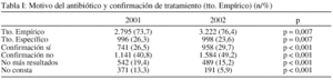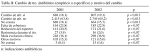 Conclusiones: Predominio, con tendencia al aumento, de las indicaciones empíricas. Bajo porcentaje de cambios en el tratamiento antibiótico inicial. Mejoría del nivel de cumplimentación global en el periodo 2002.