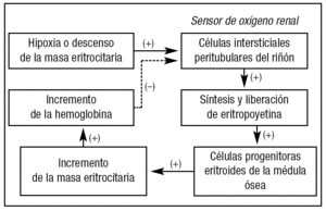 Figura 1. Regulación de la síntesis y liberación de eritropoyetina endógena. (+): estimulación; (-): inhibición.