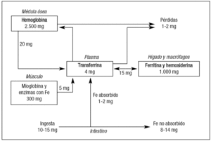 En lo que respecta al aporte de materiales plásticos o nutrientes, quizás es el hierro (Fe) el que presenta un mecanismo de utilización más complejo, al que dedicaremos los siguientes párrafos. El Fe, procedente de la dieta o administrado por vía oral, se absorbe en el duodeno en forma de hierro heme y no heme a través de la membrana apical del enterocito. Esta absorción se produce en cantidad de 1-2 mg/día que vienen a cubrir las pérdidas diarias, salvo en mujeres en edad fértil en las que las necesidades son de 3 mg/día, y está regulada por las necesidades de Fe del organismo, la eritropoyesis y la hipoxia. El Fe en el enterocito puede seguir dos caminos. Una pequeña parte se almacena unida a la ferritina y el resto atraviesa la membrana basolateral del enterocito con el concurso de la ferroportina 1 para alcanzar la circulación y unirse a la transferrina (Tf)13. El destino natural del complejo Tf-Fe es ser captado por las células eritroides inmaduras, a través de los receptores de Tf localizados en su membrana plasmática, donde se aprovecha en su mayor parte para la síntesis de la Hb y formación de nuevos eritrocitos, y una pequeña cantidad se almacena en la proteína ferritina.
