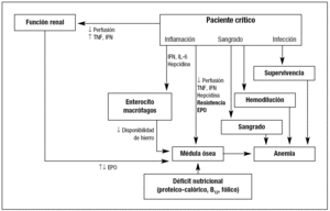 Los pacientes críticos presentan defectos en la secreción y/o mala utilización de EPO. Por ello, aunque debe evitarse la hipoxia, no se aconseja la oxigenación excesiva mantenida, ya que ésta frenaría la producción y liberación de EPO, tal como lo hace la propia transfusión sanguínea. De otra parte, existen una serie de citocinas proinflamatorias con efecto inhibitorio sobre la eritropoyesis entre las que se encuentran el factor de necrosis tumoral, el interferón gamma y la interleucina-1, que al ser liberados durante la sepsis, pancreatitis, traumatismos y cirugía, inducen un descenso en la producción de EPO; esto es, se produce una secreción de EPO inapropiada para el grado de anemia16,18,19. Recientemente, Elliot et al20 han descrito la presencia de niveles elevados de EPO e interleucina-6 durante la fase aguda de la enfermedad crítica (3 primeros días) en pacientes con fracaso renal agudo (FRA). Sin embargo, los niveles de EPO descendieron rápidamente y durante la fase crónica no fueron diferentes de los observados en pacientes sin fracaso renal. Por el contrario, durante todo el período de estudio, los niveles de interleucina-6 fueron más altos en los pacientes con FRA que en los pacientes sin FRA. Estos resultados sugieren que, al menos durante la fase aguda, en el paciente crítico con FRA, más que la producción, disminuye la acción de la EPO sobre los progenitores eritroides y que la administración de dosis farmacológicas de eritropoyetina recombinante (rHuEPO) debería realizarse en la fase crónica de la enfermedad.