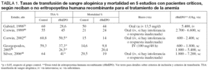 Posteriormente se han realizado varios ensayos clínicos aleatorizados y controlados más amplios. En el primero, Corwin et al46 incluyeron 160 pacientes que fueron divididos en dos grupos de 80 y que recibieron placebo o EPO (300 UI/kg/día), diariamente desde el día 3 hasta el día 7 y después en días alternos. El objetivo del tratamiento era alcanzar un hematocrito del 38% y, para ello, éste se mantuvo como mínimo hasta el día 15 o el alta, si ésta se producía antes, y como máximo hasta las 6 semanas. La administración de TSA dependía únicamente del criterio del médico. En relación con el grupo placebo, en el grupo tratado un 22% menos de pacientes recibió TSA (55% frente a 45%), y un 84% menos de unidades de concentrado de hematíes (305 frente a 166 U) y alcanzó un hematocrito más alto (35 ± 5% frente a 31 ± 4), aunque no hubo diferencias en la mortalidad entre ambos grupos (21 frente a 24%) (tabla 1).