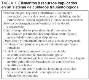 Un SCT, como se observa en la tabla 1, implica una cadena de supervivencia o mejor una cadena de recuperación que incluye medidas de prevención, emergencia extrahospitalaria, clasificación y transporte adecuado al hospital útil, el manejo inicial en la emergencia hospitalaria, los cuidados definitivos en un hospital acreditado para manejo de traumatizados graves así como la rehabilitación motora y cognitiva. Aunque todos los eslabones de la cadena que conforman un SCT son importantes, el hospital externamente acreditado para manejo del traumatismo, o trauma center en la literatura anglosajona, juega un papel fundamental.
