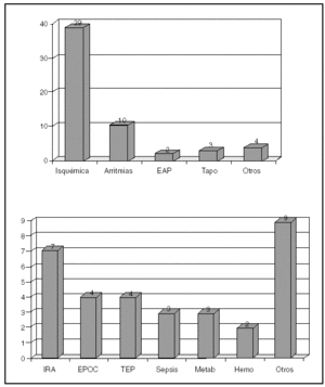 Figura 1. Origen de la parada cardiorrespiratoria: cardiológico y no cardiológico. EAP: edema agudo de pulmón; EPOC: enfermedad pulmonar obstructiva crónica; Hemo: hemorragia aguda; IRA: insuficiencia respiratoria aguda; Metab: metabólico; Tapo: taponamiento cardíaco; TEP: tromboembolia de pulmón.
