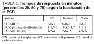A pesar de que los resultados del tratamiento de las paradas cardiorrespiratorias (PCR) se consideran un indicador de calidad del sistema sanitario, en nuestro país se carecen de datos oficiales sobre ellos. La mayoría de los estudios realizados y publicados se han centrado en las paradas extrahospitalarias (PCR-EH), y se han descrito resultados de incidencia y supervivencia muy variables. En la más extensa y reciente revisión1 se obtiene un promedio de 24 casos anuales por cada 100.000 habitantes y supervivencias al alta hospitalaria que oscilan del 2,3 al 30%. El desconocimiento de la situación de las paradas intrahospitalarias (PCR-IH) es aún mayor, con un muy escaso número de estudios publicados2. Hay que acudir a la literatura médica internacional para obtener una estimación de los resultados esperables en este ámbito, con una incidencia de unos 4 casos por cada 1.000 pacientes ingresados y una tasa de supervivencia hospitalaria de 11,2 (6,5)% referida en una revisión de 25 estudios realizados entre 1959 y 19923.