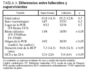 Las variables cuantitativas se presentan como media (desviación estándar) o como mediana (percentil 25-75) en función de la normalidad o no de su distribución. Las variables categóricas se presentan como porcentajes. Para la comparación entre distintos grupos se utilizaron las pruebas de la t de Student para las variables cuantitativas y de la χ2 para las categóricas. Se consideró significativa una p < 0,05. El programa utilizado para el análisis estadístico es el Statistical Package for Social Sciencies (SPSS) en su versión n.o 11. Se realizó la estimación del número de pacientes que es necesario tratar (NNT) para evitar una muerte, asumiendo que la ausencia de RCP conduce inexorablemente al fallecimiento.