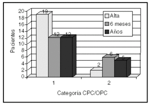 Figura 3. Resultados de las categorías de función cerebral (CPC) y de función general (OPC) (véase tabla 1) al alta hospitalaria, a los 6 meses y al año.
