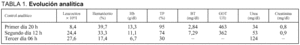 A su ingreso presenta en observación/urgencias una situación hemodinámicamente estable y había dolor a la palpación en epigastrio, sin peritonismo. Exploración cardiorrespiratoria normal. Extremidades inferiores normales. Datos complementarios: radiografía de tórax normal. ECG: ritmo sinusal a 70 lat/min, sin signos de isquemia aguda, TP 95%, TPTA 27,3 s, glucosa 180 mg/dl, CPK 76 U/l, amilasemia 848 U/l, amilasuria > 1.000 U/l. El resto queda recogido en la tabla 1.