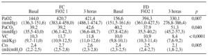 Métodos: Ventilamos mecánicamente a 12 conejos de raza New Zealand en la modalidad de volumen control (volumen corriente (VC) = 10 ml/kg, presión positiva al final de espiración (PEEP) = 0 cmH2O; frecuencia respiratoria necesaria para obtener normocapnia y fracción inspirada de oxígeno (FiO2) = 0,4) durante un período basal de 30 minutos. Después se aumento la FiO2 a 1 durante 60 minutos para inducir atelectasias de absorción. Los animales fueron aleatorizados al grupo de flujo constante (FC) o flujo decelerado (FD) (modalidad de presión control con la presión pico necesaria para mantener el VC previo) y ventilados durante 3 horas. Se recogieron los parámetros de intercambio gaseoso y mecánica pulmonar basales, tras inducir la atelectasia y 3 horas después de la aleatorización. Los datos están expresados como media e intervalo de confianza al 95% y comparados con el ANOVA de variables repetidas. Se consideró significativa una p < 0,05.