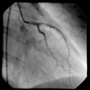 Ante la contraindicación relativa de la fibrinólisis en este contexto, se decidió la realización de un cateterismo cardíaco. En éste se objetivó arteria descendente anterior con una estenosis proximal inferior al 30%, con contenido trombótico y un flujo TIMI III (trombolysis in myocardial infarction). No se observaron lesiones en otros vasos, y la fracción de eyección ventricular fue normal. Asimismo, se evidenció una hipocinesia anterior (fig. 2).