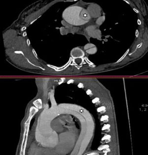 Mujer de 47 años con antecedente de aortopatía bicúspide en abuelo paterno; los padres fallecieron jóvenes en un accidente de tráfico. Por palpitaciones, se solicitó un ecocardiograma ambulatorio, observando un ventrículo dilatado con un diámetro telediastólico del ventrículo izquierdo de 71mm, indexado 3,4mm/m2, fracción de eyección del ventrículo izquierdo del 55-60% además de una válvula aórtica bicúspide con fusión entre los velos coronarianos derecho e izquierdo que condicionaba una insuficiencia aórtica severa (fig. 2) con una raíz aórtica de 40mm. Se solicitó una tomografía computarizada para estudio prequirúrgico (fig. 1) que se realizó tres semanas después, evidenciando una disección aórtica tipoA de Stanford/DeBakeyI con un flap intimal a nivel de la raíz que se extendía longitudinalmente (fig. 3) y de forma espiroidea hasta la arteria ilíaca común izquierda, involucrando el tronco braquiocefálico derecho sin comprometer su flujo. Ante estos hallazgos se trasladó a la unidad de cuidados intensivos cardiológicos para intervención quirúrgica urgente, realizándose cirugía de David con reimplante independiente del tronco braquiocefálico.