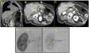 This is the case of a polytraumatized 57-year-old woman after falling from a seventh floor. When found the patient’s GCS was 13. A body CT scan reveals the presence of a SAH at the sulci of both temporal lobes, humerus proximal fracture, and multiple non-displaced rib fractures. Also, a localized hematoma of 7 cm in diameter is found in the right suprarenal region (Fig. 1A, yellow circle). Also, the CT scan reveals a thin fat plane of separation with the liver, diaphragmatic pillar, pancreas, and kidney. In the arterial phase active extravasation of contrast is seen (Fig. 1B, yellow arrow) consistent with an arterial hemorrhage. The preservation of a fat plane between the hematoma and the structures surrounding the suprarenal region (Fig. 1C, yellow circle) facilitated finding of the origin of bleeding. Previous knowledge through the CT scan of the probable vessel damaged shortens the necessary time to perform selective angiography and further embolization of the lesion (Fig. 1D, yellow arrow). The right suprarenal artery was embolized with Glubran® 2 + lipiodol (dilution 1:2), which confirmed its complete occlusion and the absence of bleeding in the final angiographic control (Fig. 1E, yellow arrow).