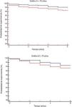 Al analizar las curvas de supervivencia en los 2 grupos de edad (<70 años y≥70 años), la transfusión de hematíes no se asoció de modo estadísticamente significativo a una menor supervivencia a largo plazo (fig. 1). La mediana del tiempo de seguimiento hasta el fallecimiento fue de 4,9 años en el grupo no transfundido, comparado con 4,8 años en los pacientes transfundidos con 1 o 2 unidades de hematíes.