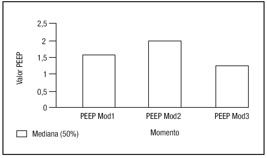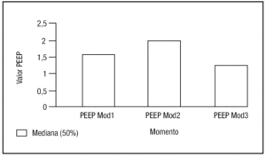 Figura 5. Valores de presión positiva al final de la espiración modificada (PEEP-mod) en los distintos momentos considerados. (1: basal; 2: a las 4-6 horas, y 3: a las 24 horas). Los valores se expresan como mediana.