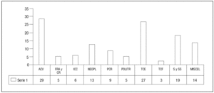 Figura 2. Causas de ingreso en Unidad de Cuidados Intensivos de pacientes que fueron sometidos a traqueostomía. ACV: accidente cerebrovascular y otras afectaciones primarias del sistema nervioso central; FRA y CR: fracaso respiratorio agudo y crónico reagudizado; ICC: insuficiencia cardíaca de cualquier causa, incluida la postinfarto agudo de miocardio; NEOPL: neoplasia de la vía aérea superior con compromiso ventilatorio per se, o como consecuencia posquirúrgica; PCR: pacientes ingresados como consecuencia de parada cardiorrespiratoria; POLITR: politraumatismos; TCE: traumatismos craneoencefálicos puros; TCF: TCE con compromiso facial; S y SS: insuficiencia respiratoria como consecuencia de sepsis o shock séptico; MISCEL: miscelánea o causas diversas.