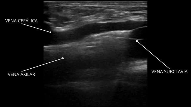 A 33-year-old male was admitted to the Intensive Care Unit due to respiratory distress secondary to Legionella pneumonia, requiring neuromuscular block and prone decubitus upon admission. We conducted prior ultrasound-guided catheterization of the right cephalic vein at its final portion where the vessel drains into the subclavian vein. The Fig. 1 and Video 1 show a longitudinal view of the catheter guide crossing the junction of the cephalic and axillary veins towards the right subclavian vein. Correct positioning was confirmed radiographically (Fig. 1). Such catheterization offers an ultrasound-guided alternative to the infraclavicular subclavian vein, which is not always accessible to ultrasound, posing an increased risk of pneumothorax that should be avoided in patients with severe respiratory failure. On the other hand, positioning is more accessible during prone decubitus compared with other venous accesses (Supplementary images).