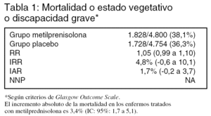 En los pacientes con traumatismo craneoencefálico el tratamiento precoz con metilprednisolona, frente a placebo, se asocia a un incremento absoluto del riesgo de muerte o discapacidad grave del 1,7%.