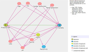 A multivariate logistic model was performed considering the cohort (C-ARDS or NC-ARDS) as the independent variable of interest and the protective MV as the dependent variable. We performed a directed acyclic graph (DAG) to choose the confounders and to avoid over-adjustment of the model. We used the dagitty tool - www.dagitty.net15. Briefly, a DAG is a graphical tool that enables the visualization of the relationships between the exposure of interest, the outcome being studied, and all other variables that are associated in some way with at least two other variables in the diagram. A comprehensive review can be found in recent reviews16,17. In this model, the following confounders were selected: age, sex, CRS, ratio of arterial oxygen partial pressure to fraction of inspired oxygen (PaO2/FiO2), arterial carbon dioxide partial pressure (PaCO2), pH, renal dysfunction (Fig. 1 in Supplementary Appendix).