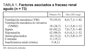 Entre los datos que analizamos como factores de riesgo para fracaso renal agudo, encontramos que 70 de los 73 pacientes estudiados habían precisado VM una media de 8,4 días antes de iniciar la TCSR, 60 (82%) fueron diagnosticados de sepsis, 62 (85%) sufrieron hipotensión que se mantuvo una media de 6 días (rango, 1-32), 14 (19%) fueron tratados con aminoglucósidos durante aproximadamente 6,5 (3,8) días (rango, 2-15 días), mientras que a 11 (15%) se les administró un contraste radiológico, y 3 pacientes (4%) padecían insuficiencia renal crónica (tabla 1).