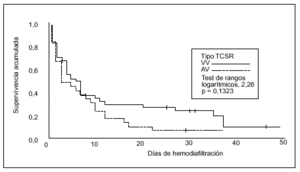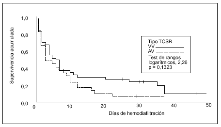 La realización de las TCSR puede llevarse a cabo mediante la utilización de la presión arterial del paciente, cateterizando una vía arterial o, por el contrario, pueden usarse máquinas que utilicen un mecanismo extractor de sangre, a través de un catéter en una vena de grueso calibre. Obviamente esta última modalidad, con un control de la extracción sanguínea más preciso y una mejor monitorización del tratamiento, debería ir acompañada de una mejoría en la evolución final de los pacientes. En nuestra casuística, sin embargo, siendo ambos grupos de pacientes similares, no se observaron diferencias significativas en la estancia ni en la mortalidad, aunque esta tendió a disminuir en los pacientes con técnica venovenosa. Esta ausencia de beneficio podría explicarse por el pequeño tamaño de la muestra.