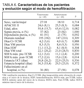 Los pacientes que fueron sometidos a una TCSR de tipo venovenoso eran similares a los que la recibieron de forma arteriovenosa (tabla 6). No había diferencias en el sexo (p = 0,714), el APACHE II (p = 0,684), la edad (p = 0,082), en la proporción de pacientes con antecedentes de sepsis (82% en ambos grupos) e hipotensión previa (91 y 75%, respectivamente). Además, la duración de la ventilacion mecánica previa al inicio de la técnica, los días transcurridos entre la elevación de la creatinina y el inicio de la depuración extrarrenal, así como el volumen residual, no difirieron de forma significativa. Aunque había una puntuación ligeramente mayor en el índice SOFA máximo que presentaban los pacientes antes de iniciar la técnica en el grupo venovenoso con respecto al arteriovenoso (12,1 fremte a 11,1; p = 0,200), ésta se hacía significativa tras instaurar la técnica (17,2 frente a 15,6; p = 0,014). Finalmente, ni la estancia en UCI (26,8 frente a 22,9 días) ni en hospital (36,3 frente a 29,5 días) difirieron de forma significativa.