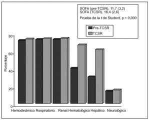 Figura 2. Desarrollo y gravedad del SDMO (n = 73). Porcentaje de pacientes con afección de los diferentes órganos según SOFA, antes y durante la TCSR.