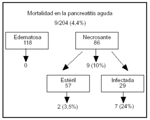 Beger et al descubrieron que la extensión de la necrosis pancreática influía en la tasa de mortalidad. Cuando más del 30% de la glándula estaba necrótica el 7% de los pacientes fallecía, y cuando la necrosis cubría toda la glándula, la tasa de mortalidad era del 50%. Además, la posibilidad de una contaminación bacteriana estaba directamente relacionada con el grado de necrosis pancreática. En pacientes con necrosis extendidas (es decir, de más del 50% del páncreas) la tasa de infección llegaba al 71%35. A partir de estos datos se llegó a la conclusión de que los pacientes con necrosis estéril extendida generalmente necesitaban tratamiento quirúrgico.