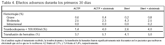 La adición de inhibidores de los receptores plaquetarios IIb/IIIa al tratamiento con ACTP o stent ha demostrado consistentemente una reducción de la incidencia combinada de muerte, reinfarto o necesidad de revascularización (5-8%) a los 30 días. Pero los resultados a los 6 o 12 meses son inconsistentes, así como el incremento del riesgo de hemorragia3-6.