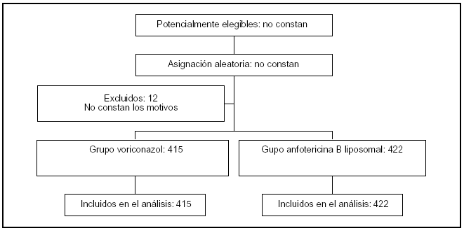 Artículo: Walsh JT, Pappas P, Winston DJ, Lazarus HM, Petersen F, Raffalli J, et al, for the National Institute of Allergy and Infectious Diseases Mycoses Study Group. Voriconazole compared with liposomal amphotericin B for empirical antifungal therapy in patients with neutropenia and persistent fever. N Engl J Med 2002;346:225-34.