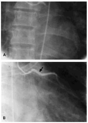 Figura 1. Proyección en oblicua anterior derecha en la que se observa una obstrucción en el tronco de la coronaria izquierda (A). Al rellenarse la arteria descendente anterior se aprecia una imagen típica de disección que se inicia en el tronco de la coronaria izquierda (B).