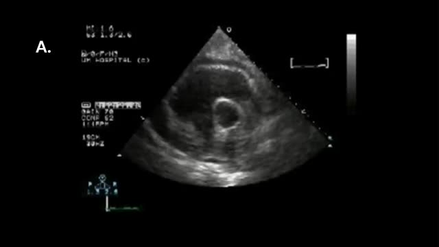Video 2. A) Derrame pericárdico con colapso diastólico precoz y sistólico de aurícula derecha de presentación tardía. B)Derrame pleural y hematoma organizado precoz en PC.