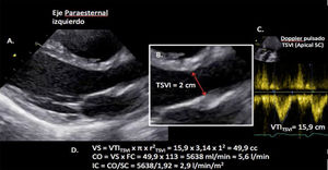 Estimación del volumen sistólico (VS) y del gasto cardiaco (CO) a través de la integral de velocidad (VTI) y radio (r) del tracto de salida del ventrículo izquierdo (TSVI). A) Paraesternal izquierdo ventrículo izquierdo en sístole. B) Zoom TSVI. C) Doppler pulsado TSVI 5C apical. D) Cálculos.