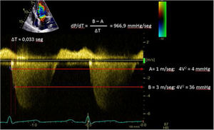 | C.2.1. dP/dt. La derivada de la presión ventricular respecto al tiempo (dP/dt) es un parámetro más frecuentemente utilizado durante el cateterismo cardiaco del ventrículo izquierdo.Por ecocardiografía, aunque no podemos medirlo, en presencia de insuficiencia mitral podemos estimar la derivada de la velocidad de su curva (dV/dt). No debe ser usado en casos de insuficiencia mitral aguda, estenosis aórtica significativa o hipertensión arterial o asincronía evidente, donde valores descendidos no implican disfunción miocárdica. | ||