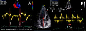 | C.2.2. Índice de Tei o índice de funcionamiento miocárdico (IFM) o índice de performance miocárdico. Permite hacer una estimación global tanto de la función sistólica como de la diastólica ventricular (derecha o izquierda). Está basado en la relación del trabajo eyectivo y no eyectivo del corazón. Se define como la relación entre la suma del tiempo de relajación isovolumétrica y de la contracción isovolumétrica, dividido por el tiempo eyectivo (índice Tei =TRIV +TCIV) /TE). Índice pronóstico poco utilizado en la práctica clínica, tendiendo a aumentar en caso de disfunción ventricular sistólica y/o diastólica.Es un método simple de obtener, reproducible, independiente de la frecuencia cardíaca y de la presión arterial, y es útil para estimar la severidad y el pronóstico de la afectación miocárdica y como predictor de disfunción postoperatoria ventricular izquierda en pacientes con insuficiencia mitral con fracción eyectiva aparentemente normal (4). Un índice Tei preoperatorio >0,5 permite predecir la disfunción postoperatoria del VI en pacientes con IM con FE aparentemente normal. Podemos medirlo mediante Doppler tisular a nivel del anillo mitral (A) o Doppler espectral pulsado, colocando el volumen de muestra amplio entre el TSVI y la mitral (B). El DTI puede utilizarse también para medir el índice Tei del VD, teniendo en cuenta que el TRIV del VD es prácticamente inexistente en el VD normal. Es un parámetro no influido por la frecuencia cardiaca ni la precarga que ha demostrado correlación con la severidad y el pronóstico de diversas patologías que afectan al VD. Su valor normal por DTI es de 0,39, considerándose patológico cuando es superior a 0,55. | ||