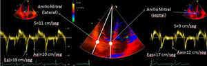 | C.3. Doppler tisular. La velocidad del anillo mitral o del miocardio basal por Doppler tisular puede ser una simple aproximación para cuantificar la función ventricular longitudinal, siendo menos dependiente de las condiciones de carga. No aplicable en casos de prótesis mitral, anuloplastia mitral o calcificación severa del anillo. Una onda S con una velocidad inferior a 8 cm/s calculado por DTI pulsado espectral en varios sitios alrededor de anillo mitral (septal, lateral y posterior) tiene una sensibilidad del 94%, una especificidad del 93% y una precisión del 94% para detectar una FE <40%. | ||