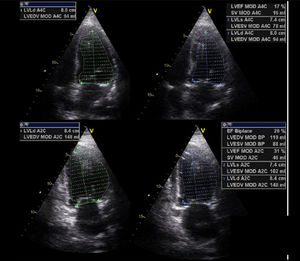 | B.1. Simpson biplanar. El cálculo de la FE por ecocardiografía 2D es el método más aplicado en la práctica clínica en la valoración de la función ventricular. La gran resolución espacial supera las limitaciones de la técnica modo-M, la mejora de los equipos, la adquisición del segundo armónico y los ecopotenciadores permiten una adecuada definición endocárdica en la mayoría de los pacientes. A pesar de que es la técnica más extendida, en ocasiones, especialmente en el postoperatorio de cirugía cardiaca, puede entrañar una complejidad técnica adicional derivada de la dificultad para obtener un plano correcto o identificar adecuadamente el borde endocárdico. Además, su cuantificación, como en otros parámetros, se ve afectada por la situación de la precarga y la poscarga. | ||