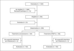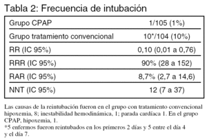 Resultados principales (tabla 2): el ensayo se interrumpió cuando se llevaba reclutado un tercio del tamaño muestral predefinido por darse uno de los criterios estadísticos definidos para interrumpir el estudio. Fallecieron 0 enfermos en el grupo tratado con CPAP y 3 en el grupo tratado convencionalmente.